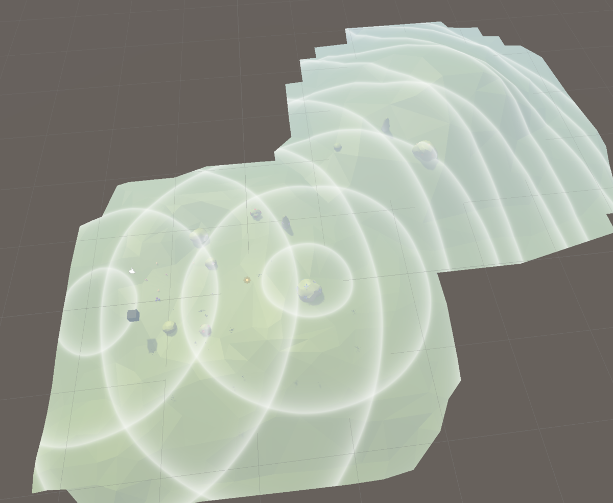 では1地点のみのソナー表現でしたが、Shader側に複数の座標パラメータを渡すことにより複数地点でのソナー表現ができるようになりました